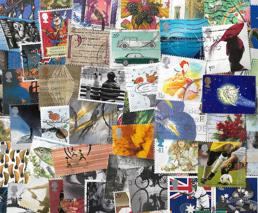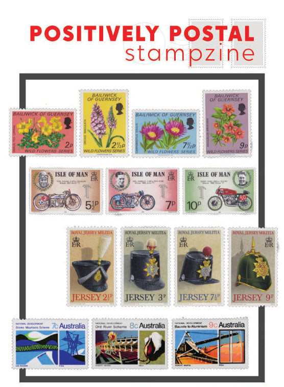 2 surprise sets of unmounted mint stamps/ 1 packet of worldwide used stamps/ 1 packet of used GB stamps/ a set of Positively Postal artist stamps/ 1 mint postcard + 1 used postcard/ Positively Postal Stampzine/ Free prize draw entry to win Stamps of the Month/ Cool mail art envelope with special postmark.